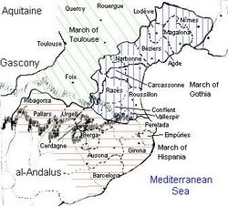 The region of Septimania was invaded by the Andalusian Muslims in 719, renamed as Arbūnah and turned into a military base for future operations by the Andalusian military commanders.[8] It passed briefly to the Emirate of Córdoba, which had been expanding from the south during the same century, before its subsequent conquest by the Christian Franks in 759,[10] who by the end of the 9th century renamed it as Gothia or the Gothic March (Marca Gothica). Eventually, the Christian Franks chased the Muslim Arabs and Berbers away from Septimania and conquered Narbonne in 759, and the Carolingian king Pepin the Short came up reinforced.[11] Septimania became a march of the Carolingian Empire and then West Francia down to the 13th century, though it was culturally and politically autonomous from the northern France-based central royal government.[5] The region was under the influence of the people from the count territories of Toulouse, Provence, and ancient County of Barcelona.[5] It was part of the wider cultural and linguistic region comprising the southern third of France known as Occitania. This area was finally brought under effective control of the French kings in the early 13th century as a result of the Albigensian Crusade, after which it was assigned governors. From the end of the thirteenth century Septimania evolved into the royal province of Languedoc.