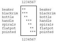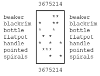 The raw data are stored in an unsorted binary contingency table indicating which design style can be found in which context by a star symbol. For example, consider the first column: context 3 contains the design styles blackrim, bottle, and handle. A beaker is contained in contexts 1 and 2. Contextual seriation sorts the design styles and the contexts in such a way that the star symbols are found as close as possible to the diagonal of the table. Of course, for a small examples like this, no computer programs are needed to find the best ordering, but for larger data sets like the 900 graves studied by Petrie they are extremely helpful.