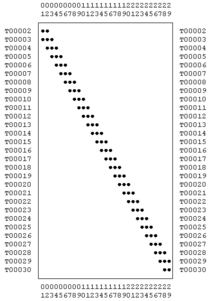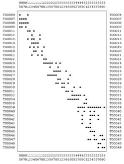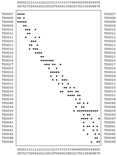 The data presented in this example was simulated by WinBasp. Initially 60 contexts (called units in WinBasp) were created along with 50 types. The contexts were labeled in chronological order by numbers 01 to 60, the types are labeled in the form T00001 to T00050. If a type is represented by one object only this object is not relevant for the chronological sequence as it does not provide a link to another context. Similarly, contexts containing one object only are irrelevant for seriation. Therefore, the contexts with one or no object and types represented by one object or not at all were eliminated. The resulting raw simulated data consisting of 43 contexts and 34 types are shown on the left. As expected, the dots indicating the occurrence of a type in a context are close to the diagonal of the table.