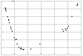 Note that the distances of the scores for adjacent contexts on the first axis vary: At the beginning and the end, the distances are extremely small, the largest distances in the centre is about 30 times as large as the smallest distance. Hill and Gauch (1979)[8] created a similar contingency table with a regular structure with each context containing six types. They note, too, that the within-context distances are smaller at the ends than in the middle. This was one of the reasons why they proposed an adjustment which is called detrended correspondence analysis.