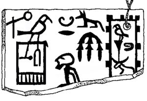 Ivory label bearing the serekh of Pharaoh Hor-Aha. It reports the victory over the "arch-using Setjet-folks" (center) and the visit at the domain "Horus thrives with the cattles" (يمين).