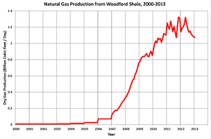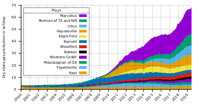عام 2007، اشتملت حقول الغاز الصخري على مصادر الغاز الطبيعي رقم 2 (بارنيت/نيوارك إيست) ورقم 13 (أنتريم) للغاز الطبيعي في الولايات المتحدة من حيث حجم الغاز المنتج.[2] ارتفع عدد آبار الغاز الطبيعي غير التقليدية في الولايات المتحدة من 18.485 عام 2004 إلى 25.145 عام 2007 ومن المتوقع أن تستمر في الزيادة[3] حتى حوالي عام 2040.