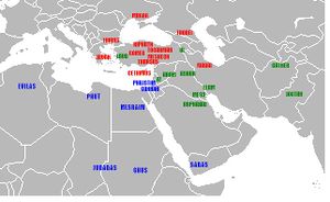 Geographic identifications of Flavius Josephus, c. 100 AD; Japheth's sons shown in red, Ham's sons in blue, Shem's sons in green.