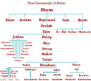 The genealogy of Shem to Abraham according to the Holy Bible, showing the origin of the Moabites, Israelites, Ammonites, Ishmaelites, Edomites, Midianites, Assurites, Leturites and Leumites.