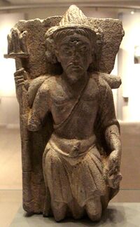 The earliest iconic artworks of Shiva may be from Gandhara and northwest parts of ancient India. There is some uncertainty as the artwork that has survived is damaged and they show some overlap with meditative Buddha-related artwork, but the presence of Shiva's trident and phallic symbolism[note 2] in this art suggests it was likely Shiva.[126] Numismatics research suggests that numerous coins of the ancient Kushan Empire (30–375 CE) that have survived, were images of a god who is probably Shiva.[127] The Shiva in Kushan coins is referred to as Oesho of unclear etymology and origins, but the simultaneous presence of Indra and Shiva in the Kushan era artwork suggest that they were revered deities by the start of the Kushan Empire.[128][129]