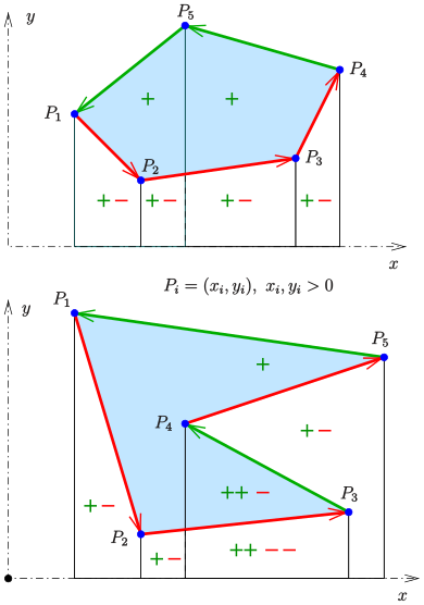 In case of the number is negative, otherwise positive or if . In the diagram the orientation of an edge is shown by an arrow. The color shows the sign of : red means , green indicates . In the first case the trapezoid is called negative in the second case positive. The negative trapezoids delete those parts of positive trapezoids, which are outside the polygon. In case of a convex polygon (in the diagram the upper example) this is obvious: The polygon area is the sum of the areas of the positive trapezoids (green edges) minus the areas of the negative trapezoids (red edges). In the non convex case one has to consider the situation more