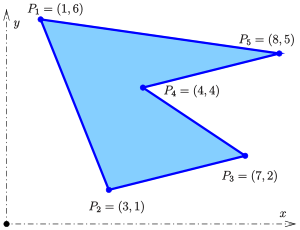 The shoelace formula, shoelace algorithm, or shoelace method (also known as Gauss's area formula and the surveyor's formula)[1] is a mathematical algorithm to determine the area of a simple polygon whose vertices are described by their Cartesian coordinates in the plane.[2] It is called the shoelace formula because of the constant cross-multiplying for the coordinates making up the polygon, like threading shoelaces.[2] It has applications in surveying and forestry,[3] among other areas.