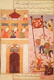 Timur became head of the Mongol Barlas tribe (a Central Asian tribe) and its vast lands by helping Amir Husayn, a Qara'unas prince and de facto ruler of Western Chagatai Khanate.[7] Timur's period as a Moghul vassal came to an end when Tughlugh Timur appointed his son Ilyas Khoja as governor of Mawarannahr. Both Timur and Amir Husayn rebelled against Ilyas Khoja but were defeated by Khoja's army at Tashkent.[8] Ilyas Khoja advanced towards Samarkand but here he was defeated by Timurid forces and forced to retreat back into Eastern Chagatai Khanate. In this way, Timur became ruler of Samarkand.[8]