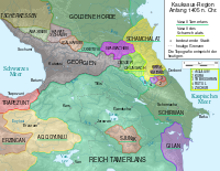 The Kingdom of Georgia, a Christian kingdom dominated on the most of Caucasus,[19][20] was subjected many times by Timur between 1386 and 1403.[21] These conflicts were intimately linked with the wars between Timur and Tokhtamysh, the last khan of the Golden Horde.[22] He officially proclaimed his invasions to be jihad against non-Muslims. Although Timur invaded the Georgia many times but he never made attempt to make Georgia a Muslim country.[2] Timur personally led most of these raids to subdue the recalcitrant Georgian monarch. Kingdom of Georgia suffered a great loss due to these invasions and never recovered again. By the time George VII was forced to accept Timur's terms of peace and agree to pay tribute, he was a master of little more than gutted towns, ravaged countryside and a shattered monarchy.[23]