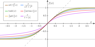 Some sigmoid functions compared. In the drawing all functions are normalized in such a way that their slope at the origin is 1.