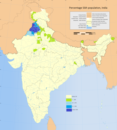السيخ كنسبة مئوية من إجمالي السكان في مختلف مناطق الهند (تعداد 2011).