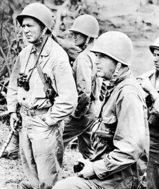 On June 18, Buckner arrived in his command jeep which was flying its standard 3-star flag to visit a forward observation post on a ridge approximately 300 ياردة (270 m) behind the front lines, as Marine infantry advanced on the Japanese-held Ibaru Ridge. Visits from the general were not always welcome as his presence frequently drew enemy fire, usually as he was departing. Buckner had arrived with his standard three stars showing on the front of his steel helmet and a nearby Marine outpost sent a signal to Buckner's position stating that they could clearly see the general's three stars on his helmet. Told of this, Buckner replaced his own helmet with an unmarked one.[11][12]