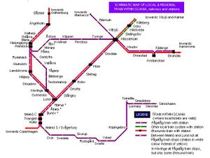 Schematic railway map of Skåne, showing train type and stations for the local Pågatågen trains,the inter-regional Øresund trains and Småland province local trains within Skåne. These three train types shares fare zones and any tickets are valid on any train of these three operators within Scania. In all there are 65 train stations in Skåne.