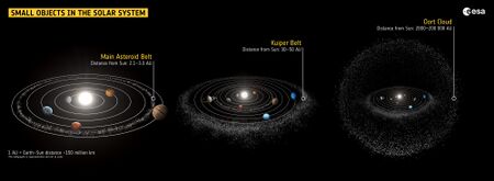 The orbits of the vast majority of small Solar System bodies are located in two distinct areas, namely the asteroid belt and the Kuiper belt. These two belts possess some internal structure related to perturbations by the major planets (particularly Jupiter and Neptune, respectively), and have fairly loosely defined boundaries. Other areas of the Solar System also encompass small bodies in smaller concentrations. These include the near-Earth asteroids, centaurs, comets, and scattered disc objects.