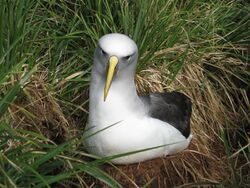 All of the Snares islands and their surrounding waters have been recognised as Important Bird Areas (IBAs) by BirdLife International for their significant seabird breeding populations. The eastern islands are notable for their Snares penguins, Buller's albatrosses, sooty shearwaters, mottled petrels and common diving petrels, as well as of Snares snipe.[7] The Western Chain hosts colonies of Snares penguins, Salvin's, Buller's and Chatham albatrosses.[8] The islands also provide a home to the endemic Snares tomtit, as well as to several endemic invertebrates such as Grypotheca horningae.