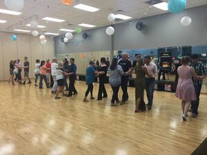 A social dancing or ballroom dancing group class taught at the Arthur Murray Dance Studio in The Woodlands, Texas.
