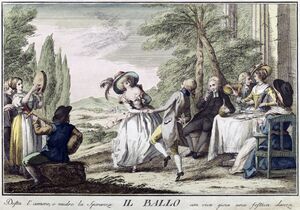 Eighteenth-century social dance. Translated caption: A cheerful dance awakens love and feeds hope with lively joy, (Florence, 1790)
