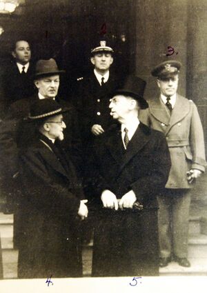 ![]() س. پنكني تك؛ الكومودور سابالو؛ النقيب سكو؛ المونسنيور ڤالريو ڤاليري؛ والسفير وليام ليهي، في أوتيل دو پارك في ڤيشي، فرنسا، يناير 1942 |