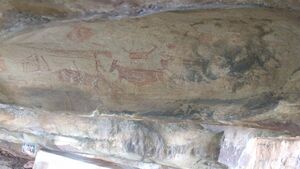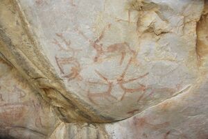 At the rock shelters of Bhimbetka there are cave paintings dating to ح. 30,000 BCE,[13][14] and there are small cup like depressions at the end of the Auditorium Rock Shelter, which is dated to nearly 100,000 years;[15] the Sivaliks and the Potwar (Pakistan) region also exhibit many vertebrate fossil remains and paleolithic tools. Chert, jasper and quartzite were often used by humans during this period.[16]