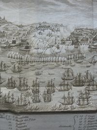 Barceló sailed from Cartagena on July 3 ahead of 5 ships of the line, 4 frigates and 68 small vessels, including gunboats and bomb vessels. The Algerines had no more than 2 demi-galleons of 5 guns each, a felucca of 6, two xebecs of 4 guns each, and 6 gunboats carrying 12 and 24-pounders to oppose them.[3] On 29 July the Spanish fleet came in sight of the town and two days later Barceló formed his line of battle and made the necessary dispositions for the attack. The bomb-ketches and gunboats, supported by xebecs and other vessels, formed the vanguard, the whole being covered by the ships of line and frigates.[15]