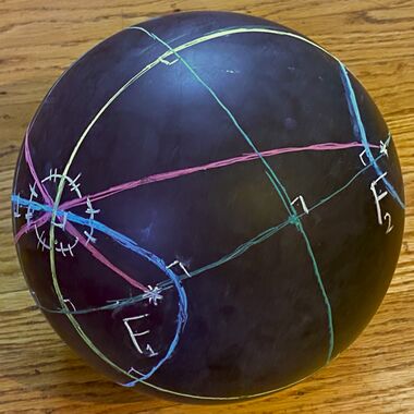 Spherical conics drawn on a spherical chalkboard. Two confocal conics in blue and yellow share foci F1 and F2. Angles formed with red great-circle arcs from the foci through one of the conics' intersections demonstrate the reflection property of spherical conics. Three mutually perpendicular conic centers and three lines of symmetry in green define a spherical octahedron aligned with the principal axes of the conic.