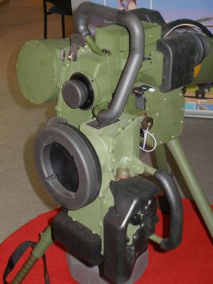 ![]() SPIKE ATGM Command & launcher unit (CLU) with mock-up SPIKE LR missile mounted on a tripod at Singapore Army Open House 2007 | |