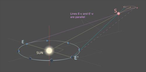 The plane of Earth’s orbit is at an angle to a line from the Sun through S. The vertices v and v' of the elliptical projection of the path of S are projections of positions of Earth E and E’ such that a line E-E’ intersects the line Sun-S at a right angle; the triangle created by points E, E’ and S is an isosceles triangle with the line Sun-S as its symmetry axis.