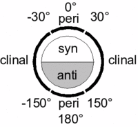 الشكل الأيمن هو "مشهد جانبي" لما تم تصوره في مسقط فيشر على اليسار, لو تم النظر على تصور فيشر من اليسار (إتجاه السهم). الروابط التى تؤدى للذرات 1 و 4 في إتجاه معاكس للروابط التى تؤدى للذرات 2, 3, 5, 6.