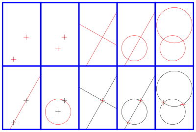 تتكون جميع تركيبات الفرجار والمسطرة من التطبيق المتكرر لخمسة إنشاءات أساسية باستخدام النقاط والخطوط والدوائر التي تم إنشاؤها بالفعل. وهي:
