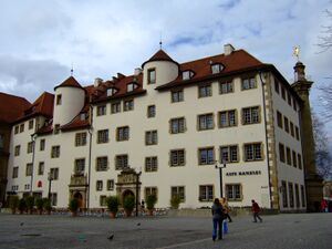 In 1488, Stuttgart officially became the de facto residence of the Count himself as opposed to the location of his home, the Old Castle.[24] Eberhard I, then Count Eberhard V, became the first Duke of Württemberg[ث] in 1495,[26] and made Stuttgart the seat of the Duchy of Württemberg in addition to the County thereof. All this would be lost to the Württembergs during the reign of his son, Ulrich. Though Ulrich initially made territorial gains as a result of his decision to fight alongside the Emperor Maximilian I,[39] he was no friend of the powerful Swabian League nor of his own subjects,[39] who launched the Poor Conrad rebellion of 1514.[40][41] Despite this and his rivalry with the Swabian League, his undoing would actually come in the form of his unhappy marriage to Sabina of Bavaria.[42] In 1515, Ulrich killed an imperial knight and lover of Sabina's by the name of Hans von Hutten,[43] obliging her to flee to the court of her brother, William IV, Duke of Bavaria, who successfully had Ulrich placed under Imperial ban twice. When the Emperor died in 1519, Ulrich struck, seizing the Free Imperial City of Reutlingen, prompting the League to intervene. That same year, Ulrich was soundly defeated and he was driven into exile in France and Switzerland following the League's conquest of Württemberg.[39] Württemberg was then sold by the League to Emperor Charles V,[44] who then granted it to his brother, Ferdinand I, thus beginning the 12 year ownership of the county by the Habsburgs.[34] When the peasants Ulrich had crushed before rose once again in the German Peasants' War,[40][41] Stuttgart was occupied by the peasant armies for a few days in the Spring of 1525. Ulrich, with the help of Philip I, Landgrave of Hesse, seized the chance to restore himself to power (albeit as an Austrian vassal)[39] in the turmoil of the Reformation and War with the Turks and invited Erhard Schnepf to bring the Reformation to Stuttgart. He accepted, was named Court Preacher in Stuttgart, and worked in concert with Ambrosius Blarer until his dismissal following his resistance to the Augsburg Interim by the Duke in 1548.[45] Duke Ulrich himself died two years later, and was succeeded by his son, Christoph. He had grown up in a Württemberg in turmoil, and wished to rebuild its image. To this end, he once again began a construction boom all over the Duchy under the direction of Court Architect Aberlin Tretsch;[46] knowing full well that the time of the Reisekönigtum was over, Christoph and Tretsch rebuilt and remodeled the Old Castle into a Renaissance palace,[38] and from 1542 to 1544, what is today the Schillerplatz was built as a town square.[26] Duke Christoph also responded to the increasing made for drinking water by embarking upon a massive hydraulic engineering project in the form of a 2،810 ft (860 m) tunnel to Pffaf Lake, the Glems, and the Nesenbach from 1566 to 1575. In 1575, Georg Beer was also appointed Court Architect, and he built the Lusthaus. But it was architect Heinrich Schickhardt who would carry Tretsch's torch further; Schickhardt constructed the Stammheim Castle in the suburb of Stammheim, rebuilt the Fruchtkasten in the today's Schillerplatz,[47] and expanded the Prinzebau.[48]
