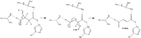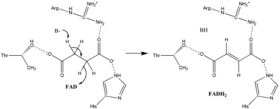 Much is known about the succinate oxidation mechanism, which involves the transfer of a proton and a hydride. A combination of mutagenesis and structural analysis identifies Arg-286 of the SDHA subunit (E. coli numbering) as the proton shuttle. Crystal structures of the enzymes from multiple organisms shows that this is well poised for the proton transfer step. Thereafter, there are two possible elimination mechanisms: E2 or E1cb. In the E2 elimination, the mechanism is concerted. The basic residue or cofactor deprotonates the alpha carbon, and FAD accepts the hydride from the beta carbon, oxidizing the bound succinate to fumarate—refer to image 6. In E1cb, an enolate intermediate is formed, shown in image 7, before FAD accepts the hydride. Further research is required to determine which elimination mechanism succinate undergoes in Succinate Dehydrogenase. Oxidized fumarate, now loosely bound to the active site, is free to exit the protein.