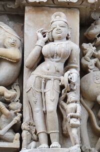 In temple sculptures, the surasundaris are often depicted as attendants of gods and goddesses. They also manifest as dancing apsaras.[5] A salabhanjika or tree nymph is another variation of a surasundari.[1] Other forms of a surasundari include:[1]