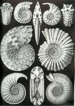 A variety of ammonite forms, from Ernst Haeckel's 1904 Kunstformen der Natur (Artforms of Nature).