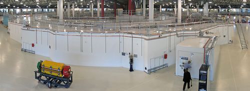 داخل منشأة السنكروترون الأسترالي. حلقة تخزين تهيمن على الصورة، تـُظهـِر optical diagnostic beamline at front right. In the middle of the storage ring is the booster synchrotron and linac