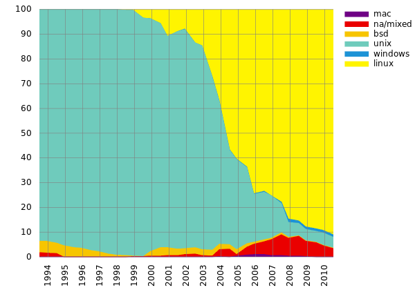 حصة عائلات أنظمة التشغيل في أجهزة الحاسوب الفائقة على توپ 500 حسب الاتجاه الزمني.