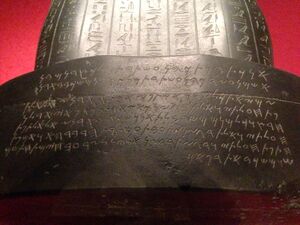 The inscription is known as KAI 13. The Egyptian hieroglyphic inscription shows that the sarcophagus was originally intended for an Egyptian general named "Pen-Ptah" (pꜣ-n-pth).[12] Transcribed in equivalent Hebrew letters, the Phoenician text is readable by a modern Hebrew speaker, with a few distinctions: as is customary in Phoenician, the direct object marker is written אית (ʾyt) instead of את (ʾt) in Hebrew, and relative clauses ('which', 'who') are introduced with אש (ʾš) instead of אשר (ʾšr) in Hebrew.[13] Among less common words in modern Hebrew, the inscription uses חרץ for gold (Biblical חָרוּץ) and אר for the verb 'to gather' (אָרוּ 'they gathered', Biblical אָרָה).[14]