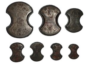 The standard ingot of China weighs about 50 taels (from 49 to 54) and, formerly called ting 鋌, is now called pao 寶 (jewel, article of value, as in the inscription on the copper cash tung-pao 通寶 = "current coin") and more commonly yuan-pao 元