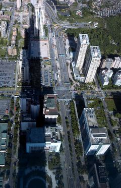 Shadow of Taipei 101 tower in the late afternoon. The adjoining park (bottom) acts as the face of a sundial.
