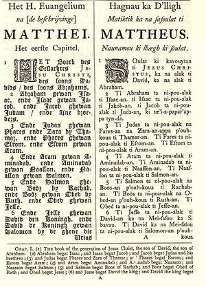 When the Dutch arrived in 1624 at Tayouan (Anping) Harbor, Siraya-speaking representatives from nearby Saccam village soon appeared at the Dutch stockade to barter and trade; an overture which was readily welcomed by the Dutch. The Sirayan villages were, however, divided into warring factions: the village of Sinckan (Sinshih) was at war with Mattau (Madou) and its ally Baccluan, while the village of Soulang maintained uneasy neutrality. In 1629 a Dutch expeditionary force searching for Han pirates was massacred by warriors from Mattau, and the victory inspired other villages to rebel.[117] In 1635, with reinforcements having arrived from Batavia (now Jakarta, Indonesia), the Dutch subjugated and burned Mattau. Since Mattau was the most powerful village in the area, the victory brought a spate of peace offerings from other nearby villages, many of which were outside the Siraya area. This was the beginning of Dutch consolidation over large parts of Taiwan, which brought an end to centuries of inter-village warfare.[118] The new period of peace allowed the Dutch to construct schools and churches aimed to acculturate and convert the indigenous population.[119][120] Dutch schools taught a romanized script (Sinckan writing), which transcribed the Siraya language. This script maintained occasional use through the 18th century.[121] Today only fragments survive, in documents and stone stele markers. The schools also served to maintain alliances and open indigenous areas for Dutch enterprise and commerce.