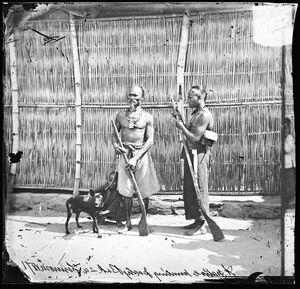 The plains indigenous peoples mainly lived in stationary village sites surrounded by defensive walls of bamboo. The village sites in southern Taiwan were more populated than other locations. Some villages supported a population of more than 1,500 people, surrounded by smaller satellite villages.[95] Siraya villages were constructed of dwellings made of thatch and bamboo, raised 2 m (6.6 ft) from the ground on stilts, with each household having a barn for livestock. A watchtower was located in the village to look out for headhunting parties from the Highland peoples. The concept of property was often communal, with a series of conceptualized concentric rings around each village. The innermost ring was used for gardens and orchards that followed a fallowing cycle around the ring. The second ring was used to cultivate plants and natural fibers for the exclusive use of the community. The third ring was for exclusive hunting and deer fields for community use. The plains indigenous peoples hunted herds of spotted Formosan sika deer, Formosan sambar deer and Reeves's muntjac as well as conducting light millet farming. Sugar and rice were grown as well, but mostly for use in preparing wine.[96]