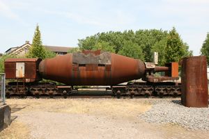A torpedo car or bottle car is a type of railroad car used in steel mills to haul molten pig iron from the blast furnace لتبدأ عملية صناعة الصلب الأساسية.