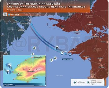 في ليل الخميس 24 أغسطس 2023، قامت أربع قوارب أوكرانية تحمل العديد من وحدات القوات المسلحة الأوكرانية بالهبوط على أرض القرم. وقاموا برفعوا العلم الأوكراني وصوروا مقاطع فيديو لاستخدامها كنوع من الدعاية، ثم جرت تصفية 15-20 منهم وهرب الآخرون على متن قواربهم.[5]
