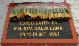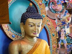The main temple in the monastery, to the west of the entry gate, is known as the Dukhang ('Du' means "assembly" and 'Khang' means "building"[11]). It was built in 1860–61. A large image of Buddha of 18 أقدام (5.5 m) height is deified; it is gilded and decorated, and is in a lotus position. This image is on the northern face of the assembly hall and is installed over a platform and its head extends up to the first floor.[27] Next to the Buddha image there is a silver casket that holds a special thangka of the goddess Sro Devi (Palden Lhamo), which is the guardian deity of the monastery. It is said that it was painted with the blood drawn from the nose of the 5th Dalai Lama, which renders an ethereal "living quality" to the thanka. This thangka image, also known as Dri Devi, was donated to the monastery by the 5th Dalai Lama.[27] The main temple fell into a dilapidated condition and was renovated in 2002 in the traditional Buddhist architectural style. It has been exquisitely decorated with paintings, murals, carvings, sculptures and so forth.[8]