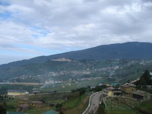 The monastery is situated near the top of a mountain, at an elevation of about 10،000 أقدام (3،000 m), with a commanding view of the Tawang Chu valley, which comprises snow-capped mountains and coniferous forest. It is bounded on its southern and western flanks by steep ravines formed by streams, a narrow spur on the north and a gently sloping ground on the east. The monastery is entered from the northern direction along a sloping spur, which has alpine vegetation.[2][3][4][5] [1] Nearby Tawang Town, named after the monastery, is well connected by road, rail and air services. Bhalukpong, which is the nearest rail head, is 280 كيلومتر (170 mi) away by road. Tezpur Airport is the nearest airport at a road distance of 350 كيلومتر (220 mi).[6]