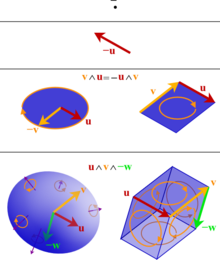Geometric interpretation of grade n elements in a real exterior algebra for n = 0 (signed point), 1 (directed line segment, or vector), 2 (oriented plane element), 3 (oriented volume). The exterior product of n vectors can be visualized as any n-dimensional shape (e.g. n-parallelotope, n-ellipsoid); with magnitude (hypervolume), and orientation defined by that on its n − 1-dimensional boundary and on which side the interior is.[8][9]