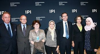 في ندوة تريگڤى لي السنوية الخامسة للحريات الأساسية (في نيويورك، 28 سبتمبر 2012)، من اليسار: رئيس معهد السلام العالمي، تري رود-لارسن، وزير خارجية النرويج إسپن بارت آيده، رئيس Idea ڤيدار هلگسن، رئيسة مجموعة الأزمات الدولية لويز آربر، الناشطة المصرية إسراء عبد الفتاح، احدى مؤسسي حركة 6 أبريل، والناشط الليبي علاء مرابط (مؤسس ورئيس صوت المرأة الليبية)، ونائبة وزير الخارجية الأمريكي ماريا أوتـِرو، وشابة محجبة غير معروفة.[4]