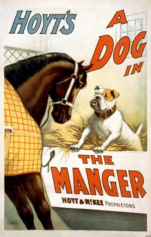 Popular artistic allusions to the fable, or the idiom arising from it, were especially common during the 19th century. Where Lope de Vega had adapted the theme to a problem play in the 17th century, the Belgian composer Albert Grisar used it as the basis for his one-act comic opera of 1855, Le chien du jardinier.[19] The idiom was also taken up in the US by the successful writer of farces, Charles H. Hoyt, where a horse rather than the more common ox figured on the 1899 poster (see left). The title has also been used in various media since then, but without reference to the fable in publicity or on covers.