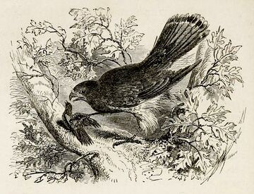 The condemnation of arbitrary power originally implicit in the fable was not entirely lost, however. Illustrations of La Fontaine's more nuanced telling by Carle Vernet[14] and Auguste Delierre (1829-1890)[15] underline the violence of the scene. At the centre of a calm and beautiful landscape, the bird of prey rips up the tiny songbird's breast. The Russian fabulist Ivan Krylov carries that violence over into his adaptation of the story as “The cat and the nightingale”.[16] There the cat captures a nightingale in what it claims is a friendly spirit and begs to hear its famous song. When the bird gives only a shrill cry of distress, the cat devours it, bones and all. Written in 1824, the story satirised the strict literary censorship of the time in Russia.