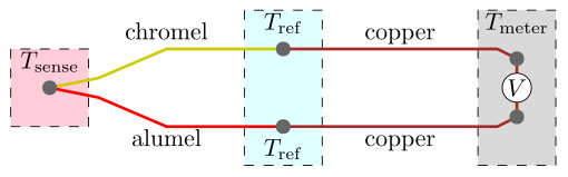 دالة مميزة E(T) لنوع المزدوج الحراري الذي يتطلب مدخلات: الجهد الحراري المُقاس V ودرجة حرارة الوصلة المرجعية Tref. حل المعادلة E(Tsense) = V + E(Tref) yields Tsense. في بعض الأحيان تكون هذه التفاصيل مخفية داخل جهاز يحزم كتلة الوصلة المرجعية (حيث تشير إلى Tref مقياس الحرارة)، مقياس الجهد الكهربائي وحل المعادلات