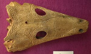 Thoosuchus superficially resembles the more derived trematosaurids, but can be distinguished from them on the basis of a deep, narrowing otic notch.[11][12] It had widely spaced orbits and a moderately elongated skull roof that was well ornamented with ridges and grooves, especially on the parietals.[13] This ornamentation is also a characteristic of trematosaurids and has been described as representing a "zone of intensive growth".[14][15] The well developed lateral line system of Thoosuchus is indicative of its presumed aquatic lifestyle.